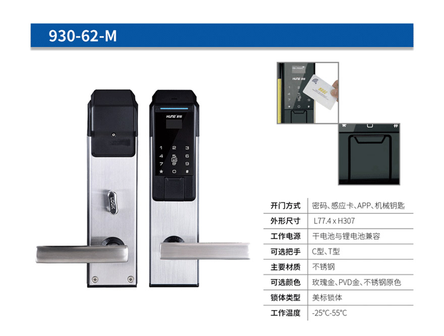 開門方式:感應(yīng)卡,APP,機(jī)械鑰匙,密碼,臨時密碼