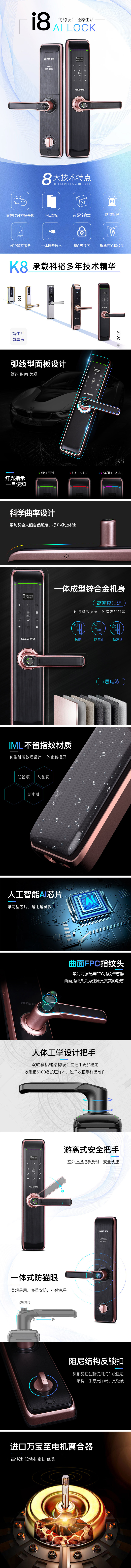 1、人機工程學(xué),時尚一握開把手設(shè)計,弧線形面板,簡約時尚全新IML設(shè)計杜絕指紋殘留,雙軸套游離把手有效防松動,萬寶至電機,快速秒開門,多種開鎖方式,可手機遠程操控,科技感十足